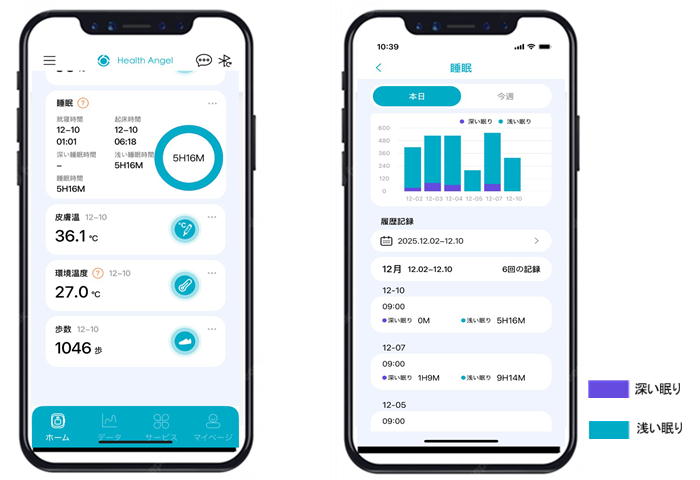 起床時間、就寝時間、睡眠持続時間、深い眠り時間、浅い眠り時間の測定表示可能。