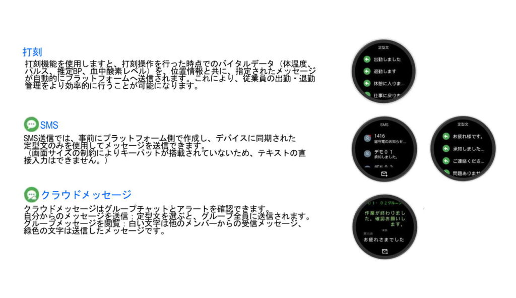 通信通話コミュニケーション可能・体温測定・バイタル管理 働く人の体調・疲労・転倒・熱中症リスクを見守るすべての機能を備える ウォッチ型ウェアラブルデバイス